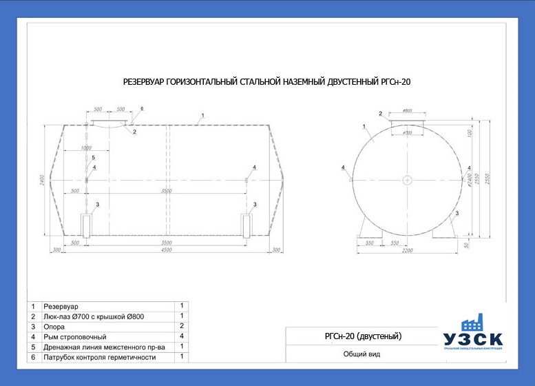 РГСДн-20: горизонтальный резервуар двустенный наземного расположения;